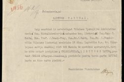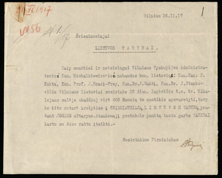 Vilniaus lietuvių susirinkimo raštas Lietuvos Tarybai dėl Vilniaus vyskupijos administratoriaus kunigo K. M. Michalkevičiaus nubaustų lietuvių kunigų. Pasirašė susirinkimo pirmininkas A. Stulginskis. Vilnius, 1917 11 26 -