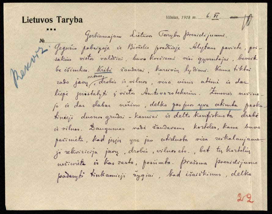 Lietuvos Tarybos nario, Vasario 16 d. Akto signataro, kun. A. Petrulio raštas Lietuvos Tarybos Prezidiumui dėl vokiečių vykdytų rekvizicijų Alytaus apskrityje. Vilnius, 1918 06 06 -