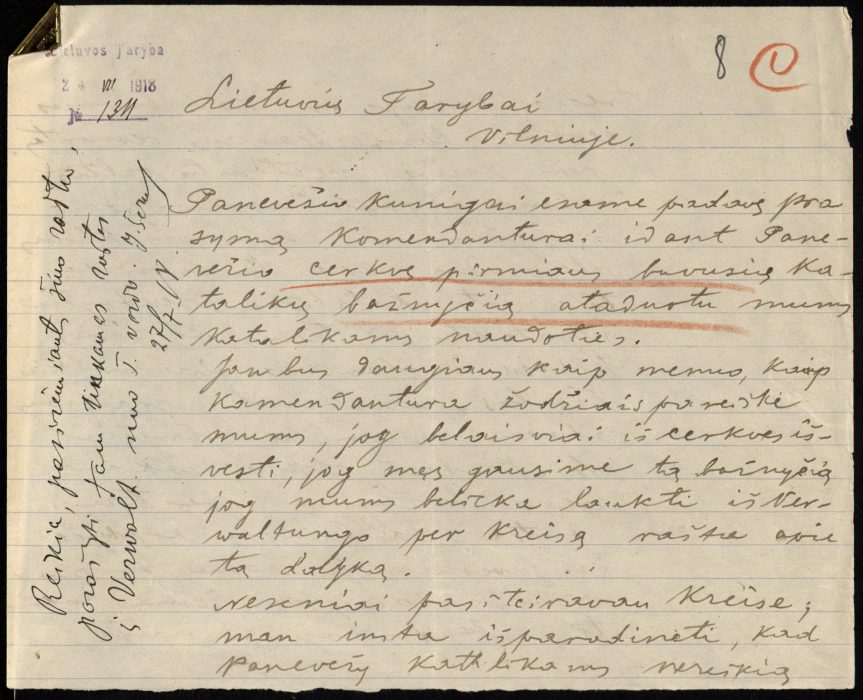 Panevėžio dekano, kun. J. Stakausko raštas Lietuvos Tarybai dėl Panevėžio cerkvės (buvusios katalikų bažnyčios) perdavimo katalikams. Pridėtas vokiečių administracijos raštas. Užrašyta J. Šerno rezoliucija. Panevėžys, 1918 07 17