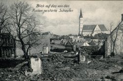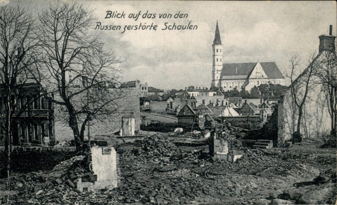 Sugriautų Šiaulių fone Šv. Petro ir Povilo bažnyčia. Atvirukas, išleistas Berlyne. [1915–1918] -
