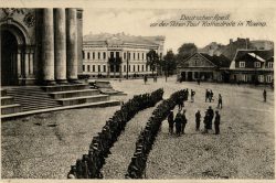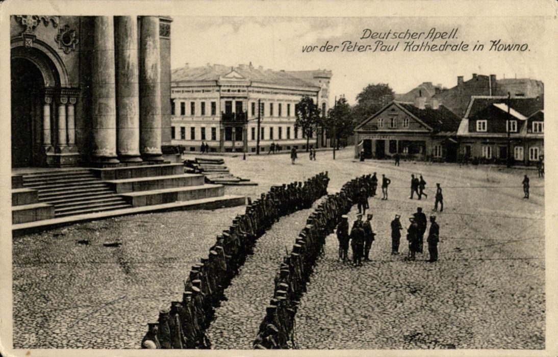 Vokiečių karių rikiuotė prie Kauno Šv. apaštalų Petro ir Povilo katedros. Atvirukas, išleistas Berlyne. [1915–1918] -