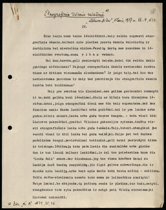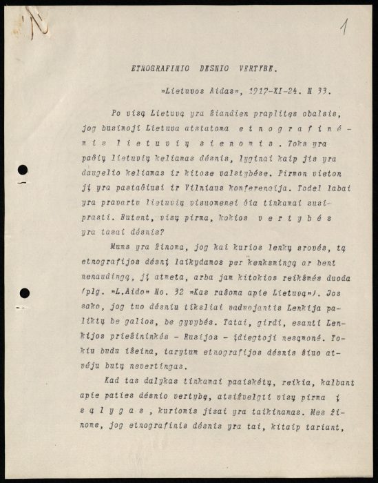 Petro Klimo straipsnio „Etnografinio dėsnio vertybė“, išspausdinto „Lietuvos aido“ 1917 m. lapkričio 24 d., nr. 33, pirmasis mašinraščio lapas. LMAVB RS, F191-40, lap. 1 -